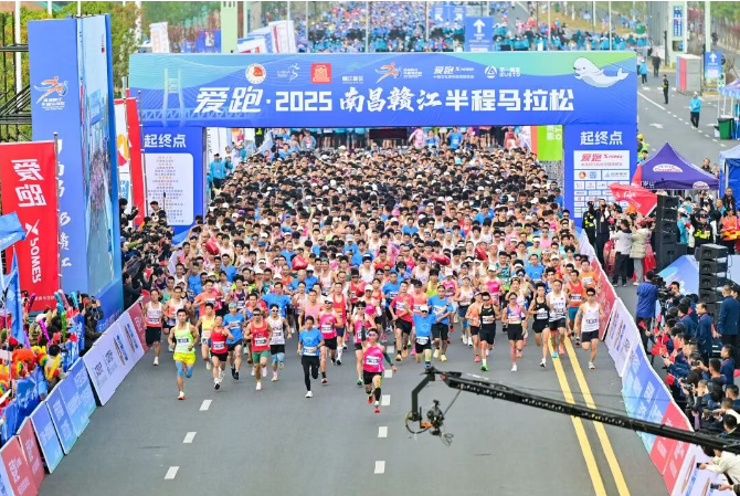随着清脆的发令枪响,来自全国各地的2万名跑者如潮水般涌出。同济建管跑团成员们也迅速融入其中,在人群中稳步前行,大家互相鼓励,一同感受着这场马拉松的热烈氛围。沿途,赣江两岸的风景如诗如画,江风轻轻拂过,带来丝丝凉意,驱散了奔跑的些许疲惫。