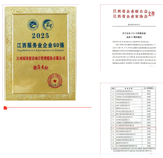 此前,同济建管已获评江西省发展改革委员会授予的“江西省服务业龙头企业”称号。作为工程建设领域的重要服务提供商,同济建管始终秉持专业、严谨、高效的服务理念,深耕工程监理与咨询领域,为各类工程项目提供全方位、全过程的专业技术服务,赢得了业主单位和社会各界的广泛赞誉。